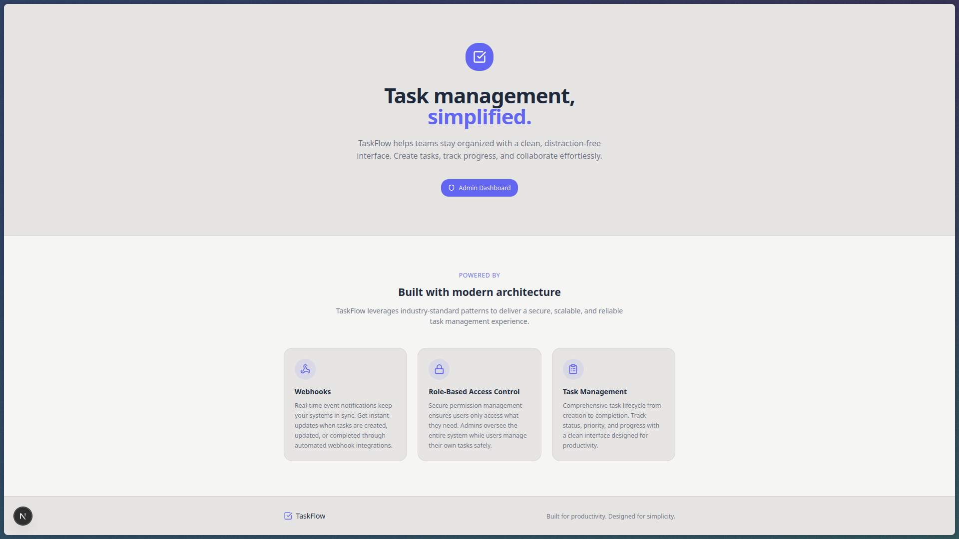 TaskFlow is a productivity-focused todo application that helps users plan, organize, and track tasks more effectively. Tasks can be assigned priorities and progress states, while role-based access control ensures proper permissions and webhooks enable event-driven updates and integrations.